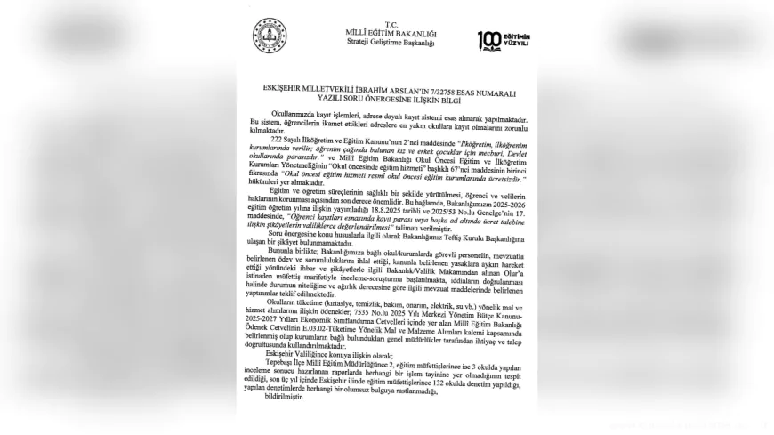 Bakanlık resmi yanıtında, 2024–2025 eğitim-öğretim yılı kayıt döneminde Eskişehir’den kayıt parası veya zorunlu bağış konusunda Bakanlığa ulaşan tek bir şikâyetin bulunmadığını bildirdi. Açıklamada, “Okul kayıtları ücretsizdir, para talep edilemez” vurgusu yapılırken, kayıtların adres bazlı sistem üzerinden yürütüldüğü ve 2025/53 sayılı genelge ile valiliklerin gerekli şekilde bilgilendirildiği belirtildi.